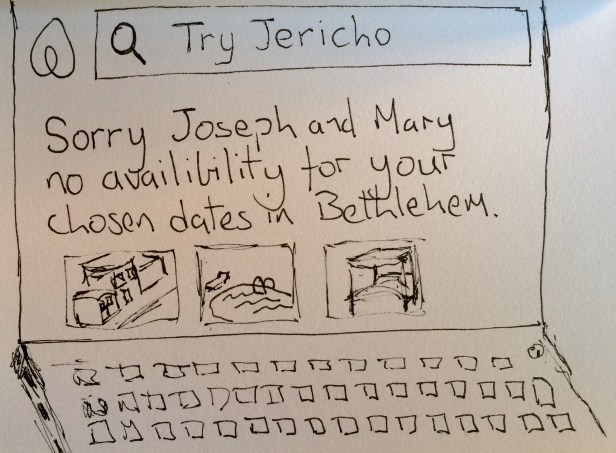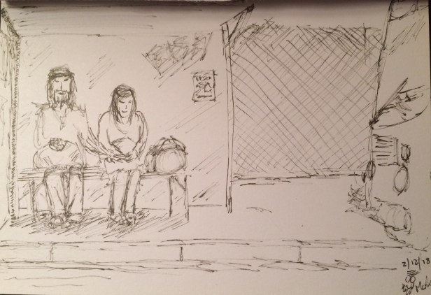 I thought going a bit more modern for Mary and Joseph waiting on a bus to Bethlehem….